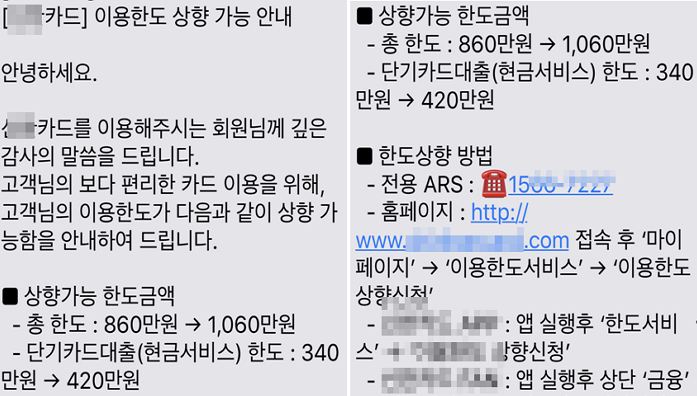 신용카드 한도조건을 성실히 채워 자격요건이 되면 해당 카드사 고객센터로부터 문자나 전화가 오는데요. 요즘은 스마트폰 어플을 통해서도 쉽게 한도 상향이 가능합니다.