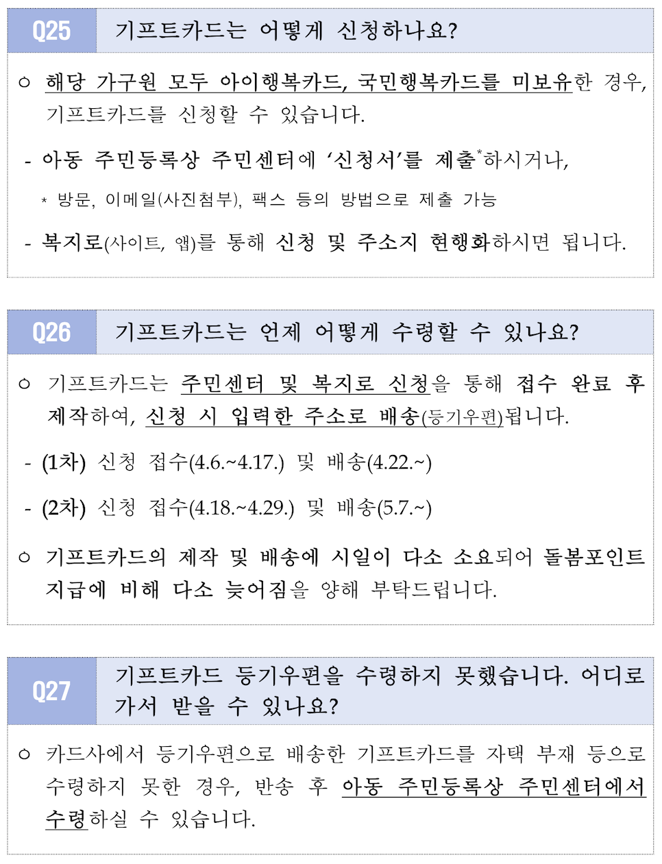 아이행복카드랑 국민행복카드 가지고 있지는 않은데 신규로 받아서 돌봄포인트를 받고 싶은 경우는 일단 기프트CARD를 신청하는게 원칙입니다.