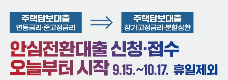 9월 15일 부터 약 한달간 기존 주택담보대출의 변동금리 / 준고정금리를 장기 / 고정금리 / 분할상환으로 전환해주는 안심전환대출 신청 접수가 시작되었습니다. 기준금리가 계속 올라가고 있는 상황에서 이러한 대출전환은 가계에 큰 도움이 되리라 생각되는데요, 아래에서 대상과 지원내용, 신청방법등을 자세히 알아보도록 하겠습니다.