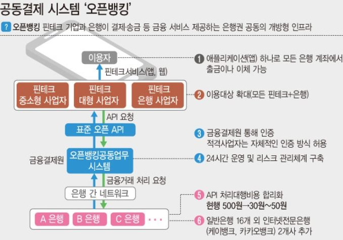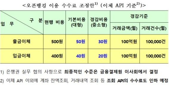 은행과 핀테크 기업 입장에서는 수수료 인하 혜택을 받는데요, 오픈뱅킹 이용과정에서 은행 등의 이용기관이 내는 수수료는 기존 금융결제망 이용 수수료의 10분의1 수준으로 낮췄으며, 이에따라 출금 이체 수수료(기존 500원)은 30~50원 입금 이체 수수료(400원)은 20~40원으로 각각 내려 간다고 합니다.