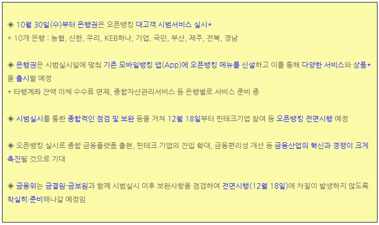하지만 18곳 은행사 모두 30일 부터 이체와 조회등을 위한 정보 제공 역활을 하며, 핀테크 기업까지 참여하는 오픈뱅킹 전면 시행은 오는 12월 18일 부터 이루어진다고합니다.