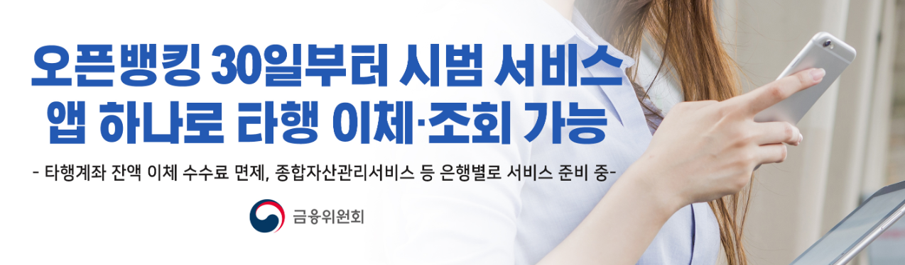 금융위원회는 29일 서울정부청사에서 오픈뱅킹 추진 현황 및 향 후 계획 설명회를 열면서, 하나의 앱으로 타 은행 계좌에서 출금과 이체가 가능한 오픈뱅킹이 오늘 30일 부터 시범 가동된다고 밝혔습니다.