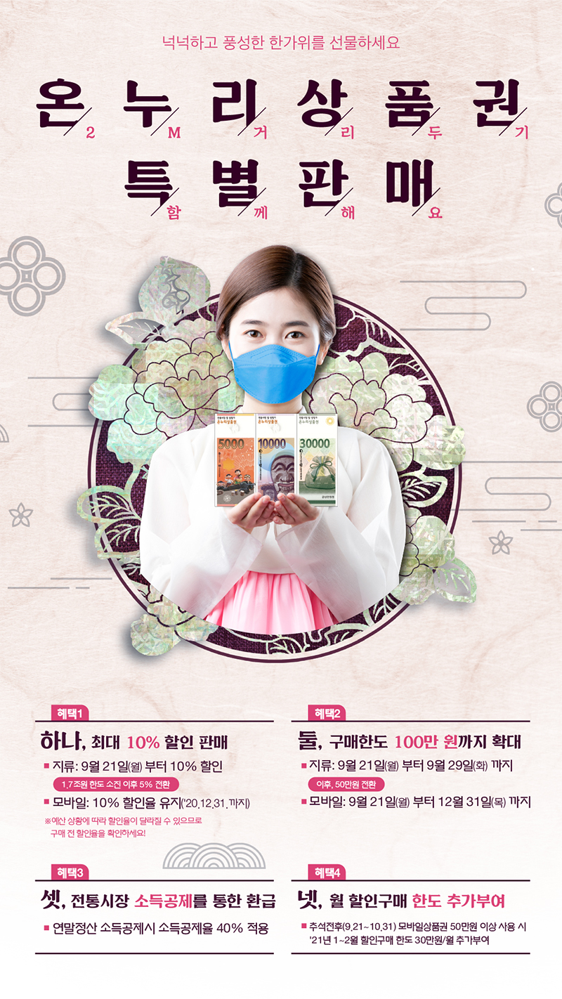 추석 명절을 맞이하여 한시적으로 온누리상품권 특별할인 및 개인 할인구매한도 상향을 시행합니다.