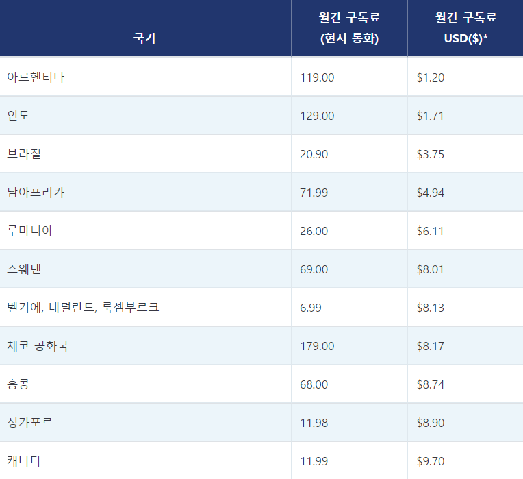 아래 이미지를 보시면 유튜브 프리미엄 서비스는 국가마다 월간 구독료가 다르다는 것을 확인할 수 있습니다.