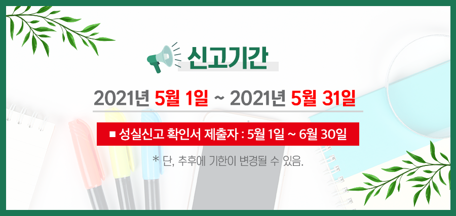 대한민국에 거주하고 있다면 누구나 2020년에 발생한 소득에 대해서 2021년 5월 31일까지 종합소득세 신고를 해야 하는데요, 즉 매년 1월 1일부터 12월 31일까지 발생한 소득에 대해서 종합소득세 신고 기간인 다음 해 5월 한 달간 신고를끝마쳐야 하는 것입니다.