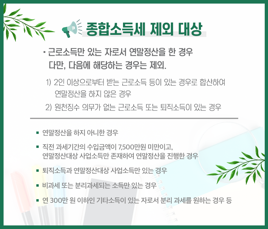 이때 근로소득만 발생한 직장인이면서 매년 진행하는 연말정산을 못한 경우에는 근로소득에 대한 연말정산을 진행했지만 이 외의 사업소득이나 이자소득, 배당소득 등이 발생한 부분했다면 5월 종합소득세 신고 대상에 포함된다는 사실을 기억해 주셔야 합니다.