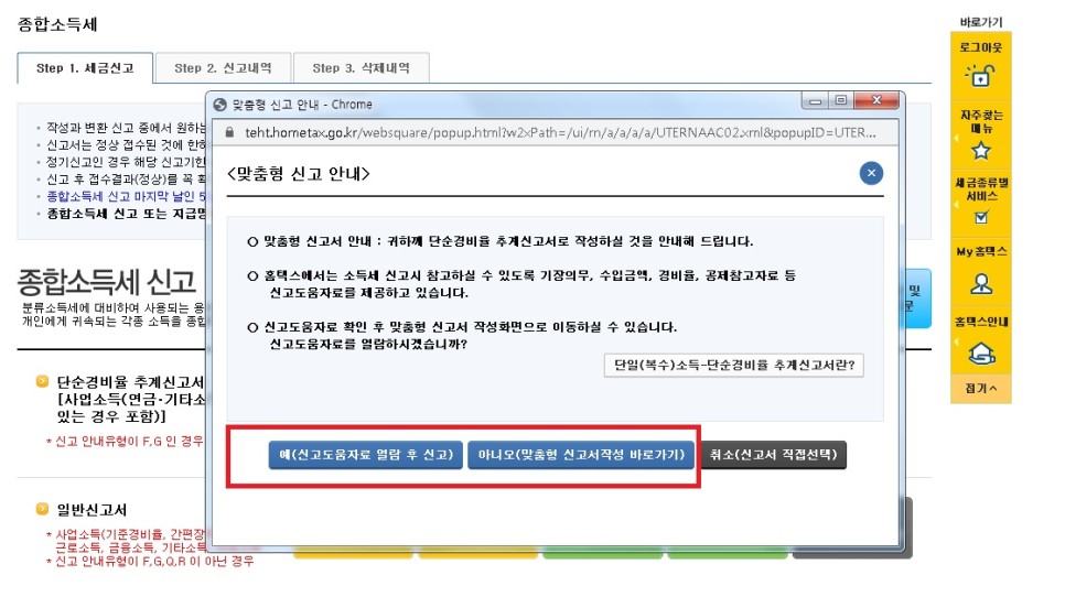 이때 팝업 차단을 하지 않았다면, 맞춤형 신고 안내 창이 활성화되는데, 신고 도움자료를 열람해야 합니다.