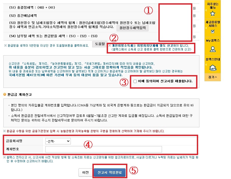 이제 신고할 사항은 마지막 단계인데요. 총결정세액, 중간예납세액, 원천징수세액합계, 납부 또는 환급 세액을 확인합니다. 개인지방소득세는 거주지 기준 지방자치단체에 별도로 신고해야 하는데, 이 부분은 뒤에서 해야 하는 부분으로 가볍게 읽고 넘어가 줍니다. 동의 항목에 체크한 후 환급 계좌를 정보를 입력하고, 신고서 작성 완료를 클릭합니다.