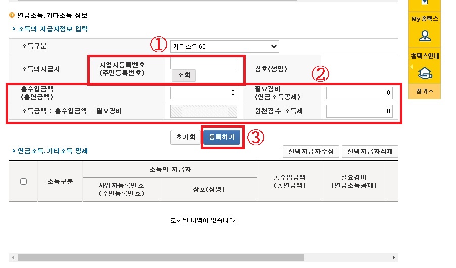 기타 소득의 발생분은 추가가 되어 있지 않을 수 있습니다. 네이버 애드포스트처럼 주 수입원은 아니지만, 일정한 수익이 발생해서 원천징수가 되었다면, 해당 업체의 사업자등록번호로 조회하고 총수입금액, 필요경비, 소득세 정보를 입력하고 등록하기를 클릭합니다.