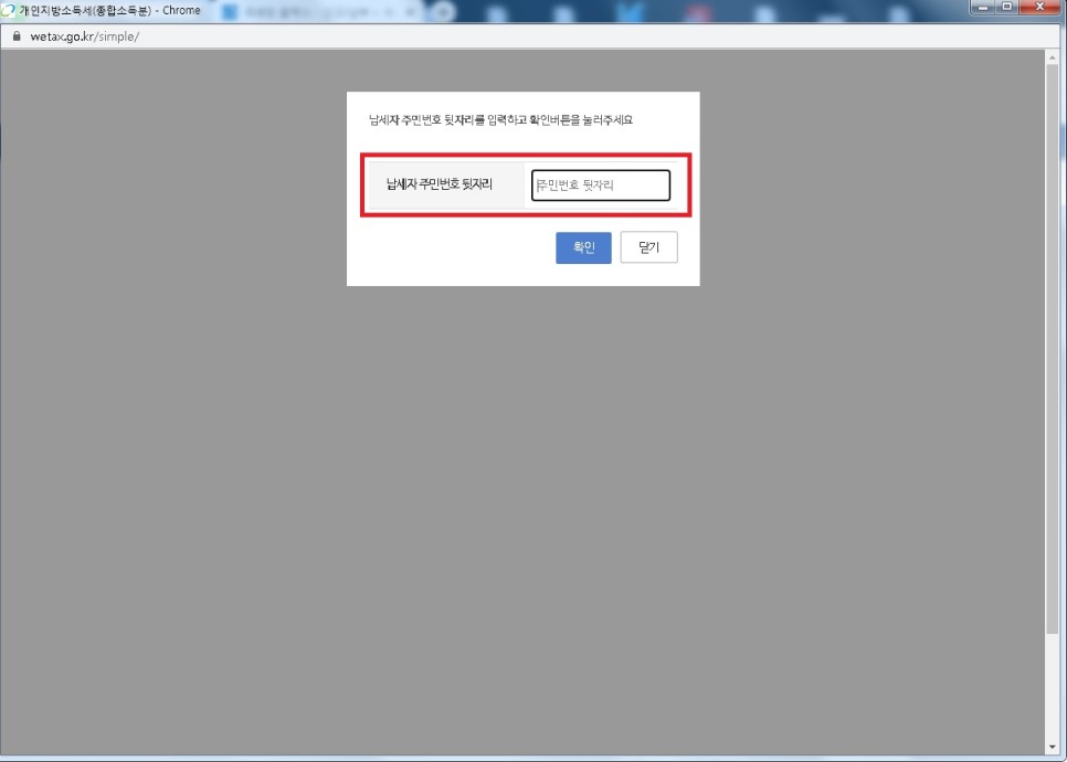 확인을 클릭하면, 위택스 페이지가 새로운 창으로 열리게 되는데, 주민번호 뒷자리를 입력하면 활성화됩니다.