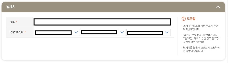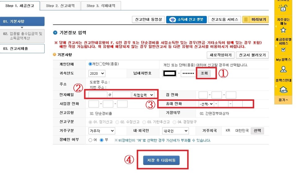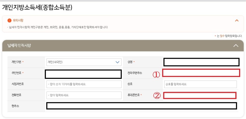 활성화된 하나의 페이지에서 모두 처리할 수 있는데, 납세자 인적 사항란에서는 전자우편주소와 휴대폰번호정도만 입력하면 됩니다