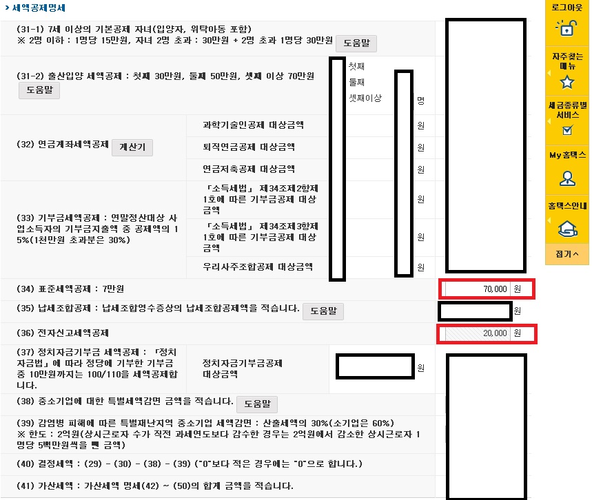 아래에서는 세액공제 대상인데 누락되어 있는 것이 없는지 살펴 보면 되는데, 표준세액공제 7만 원과 전자신고세액공제 2만 원은 기본으로 등록됩니다.