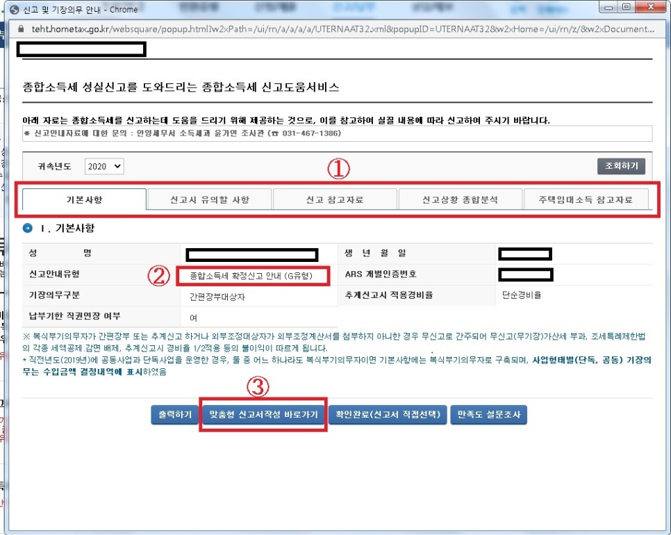 기본사항부터 신고 시 유의할 사항, 참고 자료 등을 확인할 수 있습니다. 신고 안내 유형이 G유형이 맞는지 체크하고, 이와 함께 참고자료 내용에서 국민연금보험료, 필요경비, 소득 금액, 소득세 등을 정리해 두면 역시 도움이 됩니다. 검토가 끝났다면 본격적으로 맞춤형 신고서 작성 바로 가기를 클릭합니다. 실수로 창을 닫았다면, 신고/납부 > 종합소득세를 클릭해서 다시 접속하면 됩니다.