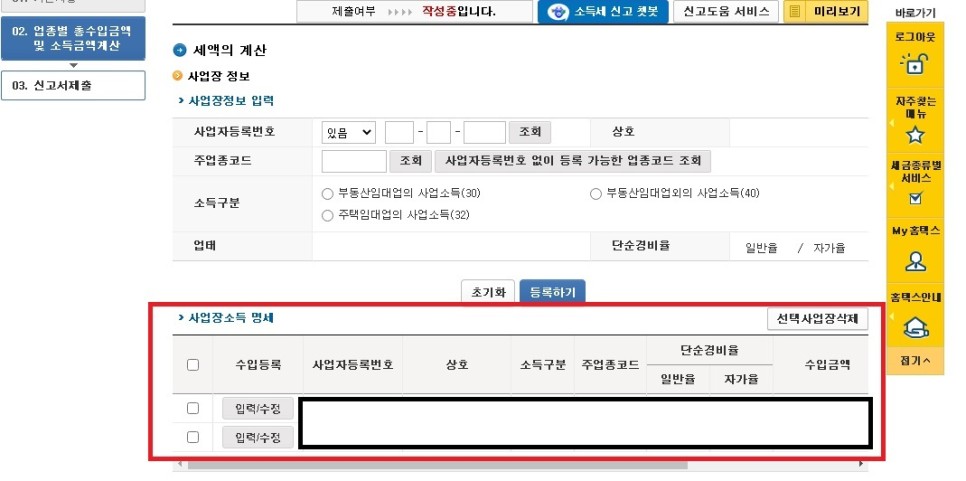 다음 페이지부터는 다소 긴 호흡을 필요로 하는데, 우선 사업장 소득 명세가 올바르게 등록되어 있는지 학인합니다. 사업자등록번호, 상호, 수입 금액 등을 체크하고 누락된 것이 있다면 추가로 등록합니다.