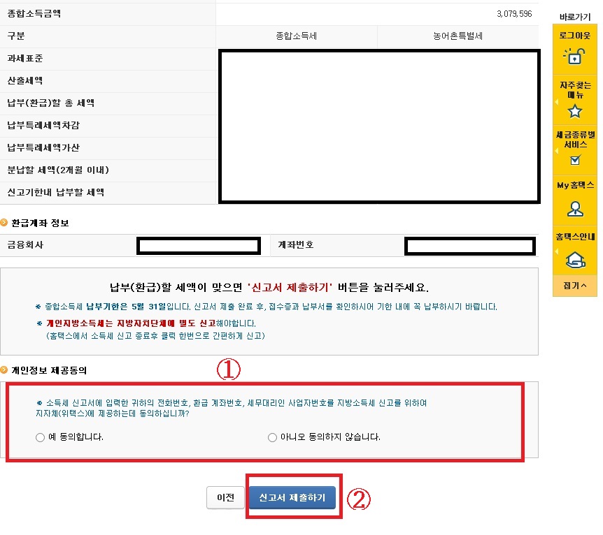 다음 페이지에서는 뭔가 실수를 하지 않았다면 개인정보 제공동의에 체크하고 신고서 제출하기를 클릭합니다. 사실 5월 말인 기한 내에는 마지막 접수를 기준으로 하게 되므로 나중에 세금을 줄일 방법을 알게 되었더라도 언제든지 활용할 수 있습니다. 시일이 지난 뒤에는 가산세가 붙을 수도 있기는 하나, 수정신고, 경정청구 등의 방법도 있으니 크게 걱정할 필요는 없겠습니다.