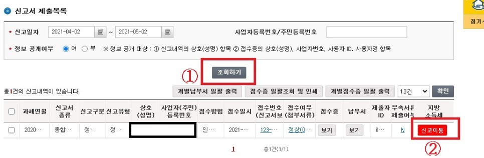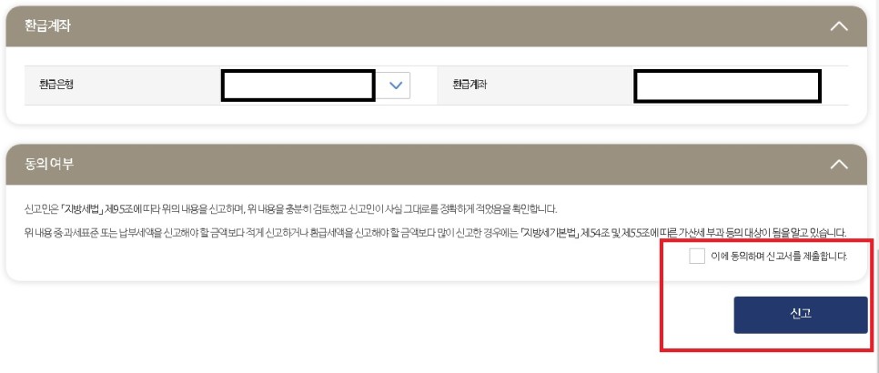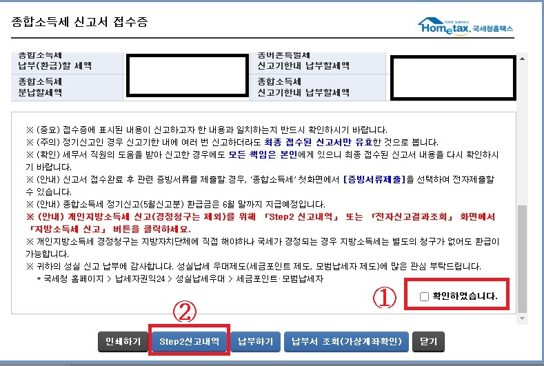 신고서 접수증 페이지를 살펴보고 하단에 체크하고 신고내역 페이지로 이동합니다.