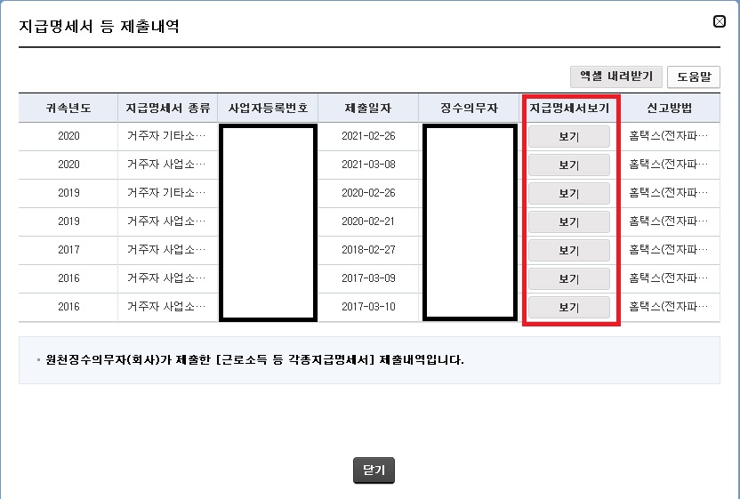 최근 내역부터 과거 내역까지 모두 확인할 수 있는데, 우측에 보기 탭을 클릭하면 세부 정보가 출력되는데요. 여기서 업종 코드, 원천징수자 사업자번호, 소득세와 지방소득세 정보들이 나오는데, 따로 정리해 두면 편하게 신고할 수 있고, 다른 곳에 제출하기 위해 출력도 할 수 있습니다.