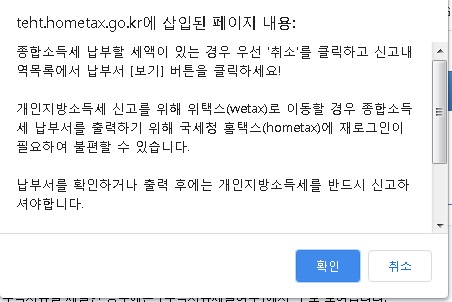 해당 페이지에서 바로 조회하기를 클릭하면, 2020년도 종합소득세 내역이 출력되는데요. 이때 우측에 보면 지방소득세 신고이동 버튼이 활성화되어 있습니다. 클릭하면 안내창이 뜨는데 위택스로 이동했을 때 홈택스에 재로그인 해야 하는 불편함에 대한 설명입니다.