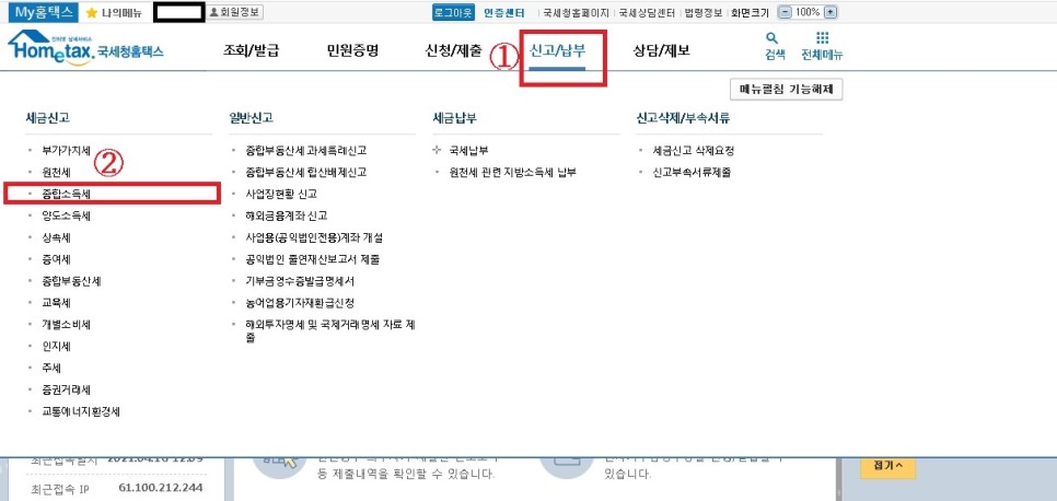 그 뒤에 홈택스 상단 메뉴에서 신고/납부 > 종합소득세를 클릭해서 신고 페이지로 이동합니다.