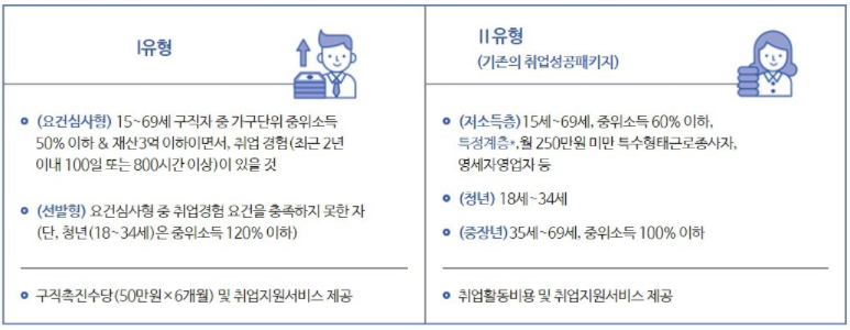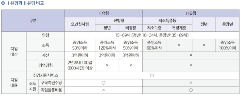 요건심사형 : 15~69세 구직자 중 가구단위 중위소득 50% 이하 & 재산 3억 이하 이면서 최근 2년 내 100일 또는 800시간 이상의 취업경험