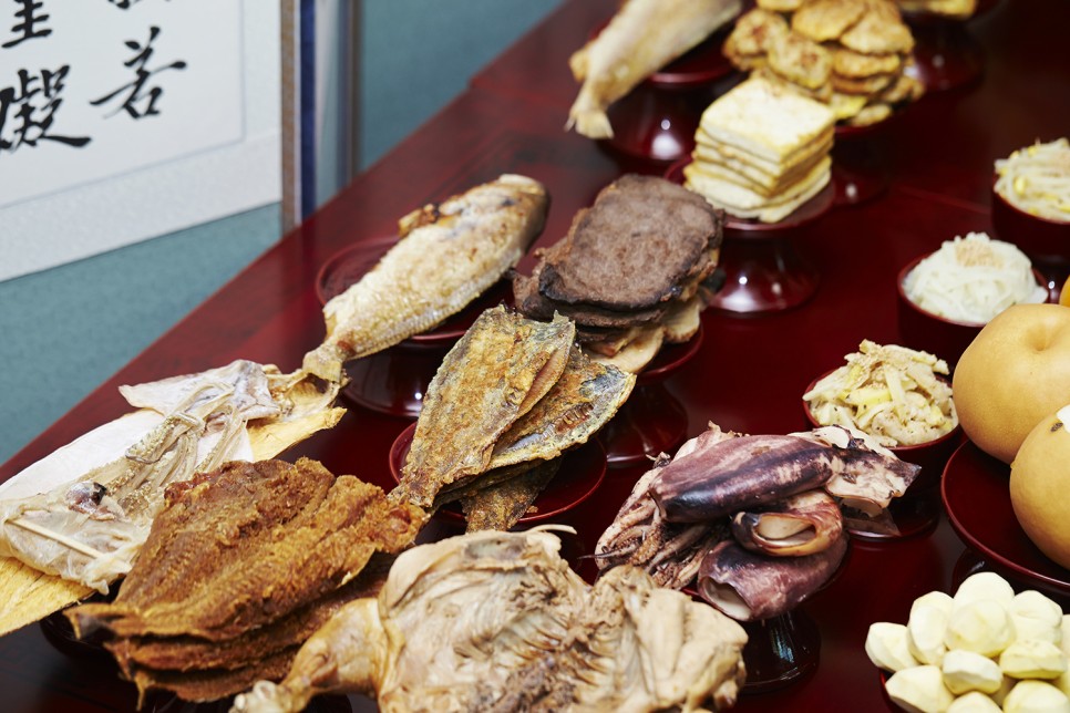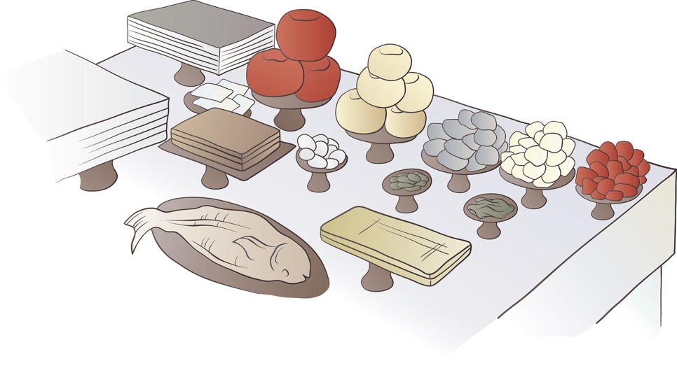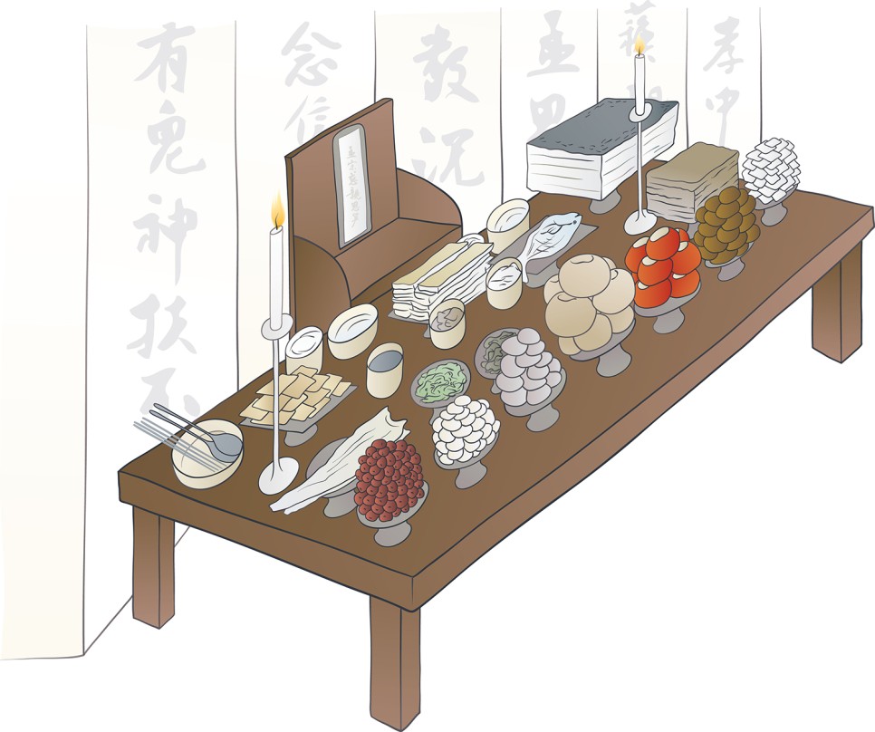 제사상은 보통 오열로 차리게 되는데 신위가 있는 방향을 첫 번째 열로 보고 있으며, 1열에는 식사 음식인 밥, 국 등이 오르고, 두 번째 열은 제사 음식의 메인 요리가 되는 구이, 전, 문어 등이 오르고, 세 번째 열에는 부수적인 요리인 탕 등이 올라가며 네 번째 열에는 나물, 김치, 육포, 두부 등 밑반찬류, 다섯 번째 열에는 과일과 과자 등 후식이 올라가게 됩니다.