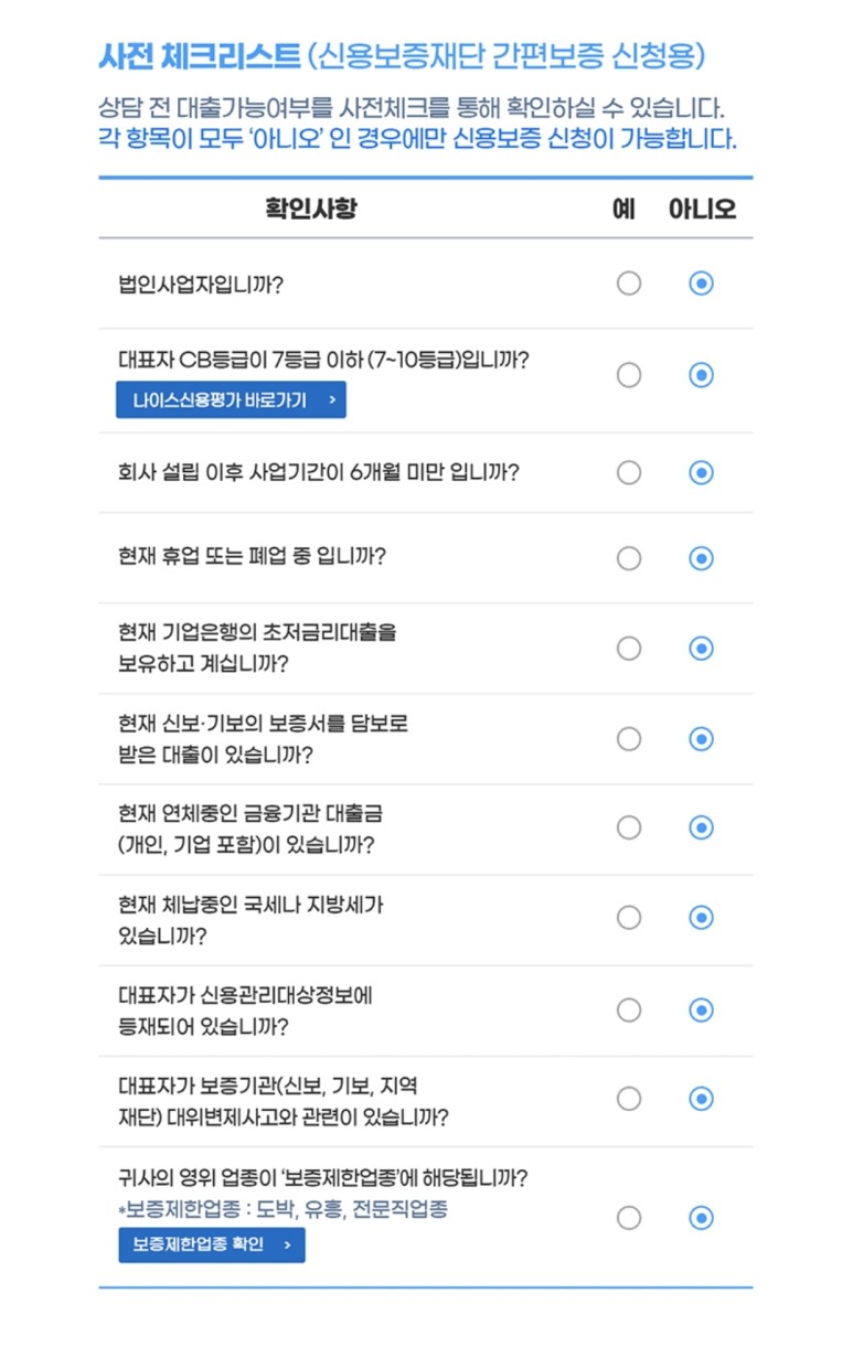 신용보증재단에서 간편보증 신청용 사전 체크리스트가 있으니 여기서 체크를 해보시면됩니다