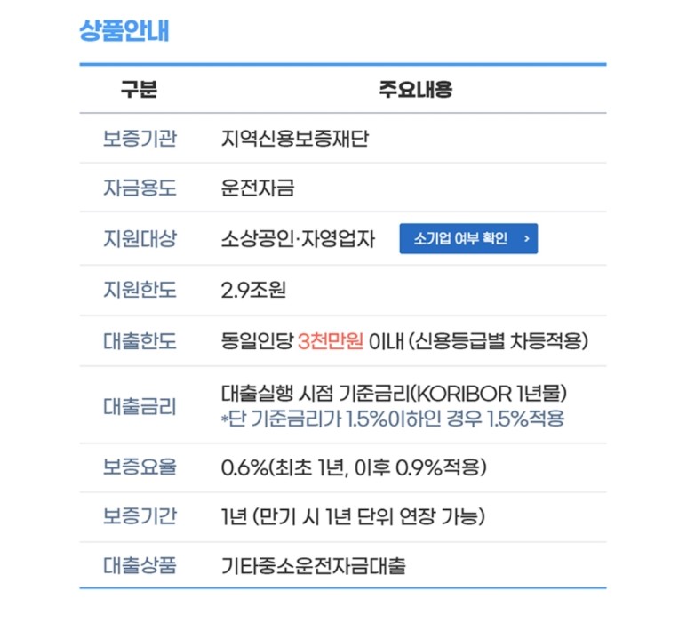 소상공인 코로나19 특별대출 금액 : 3천만원 한도