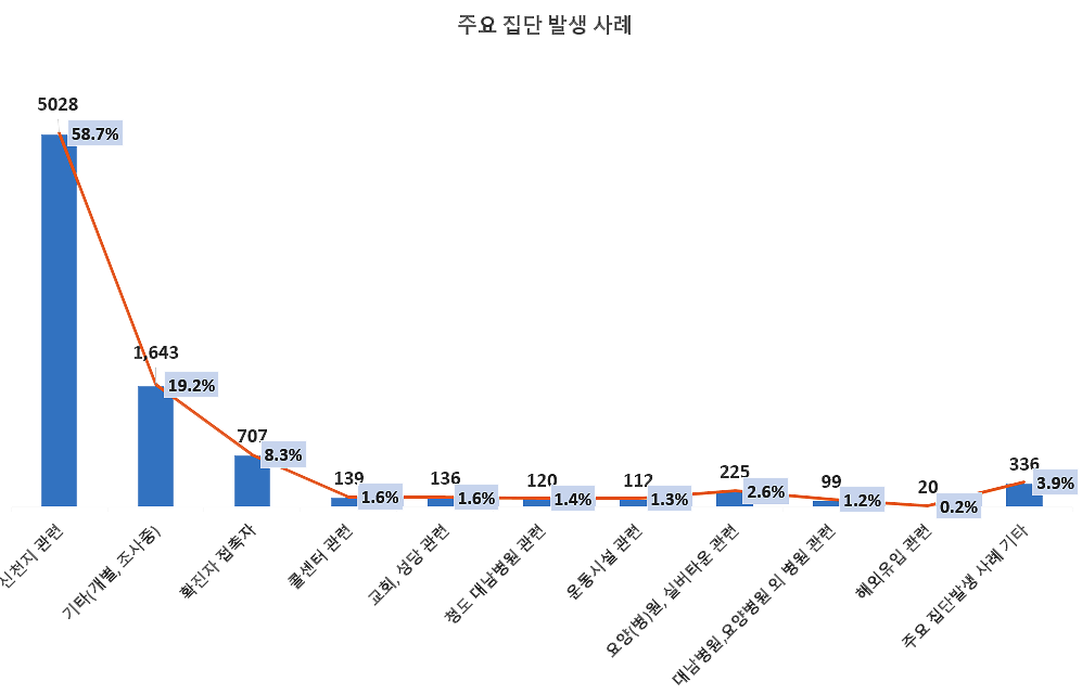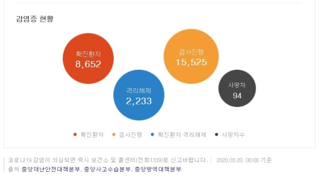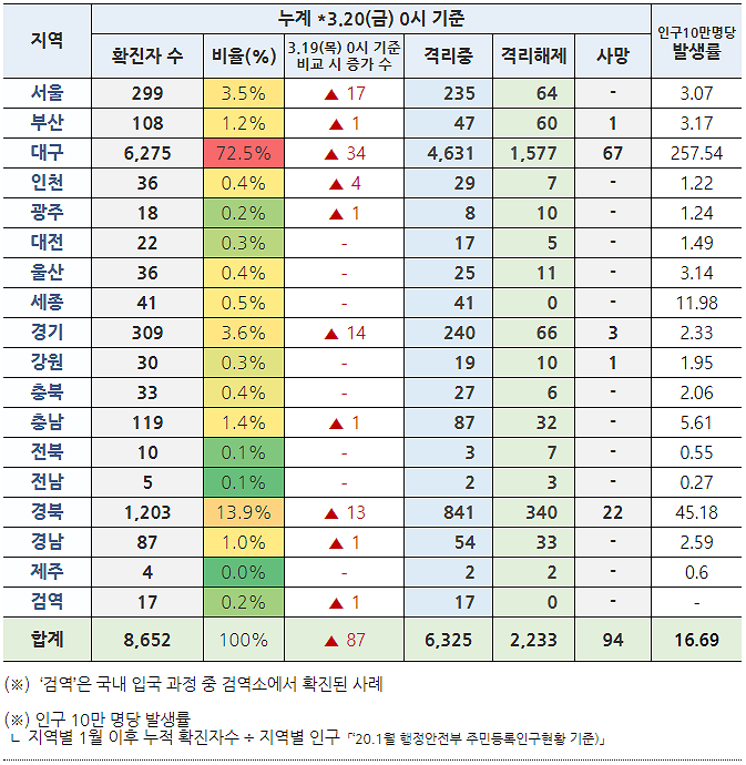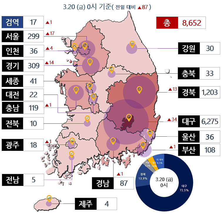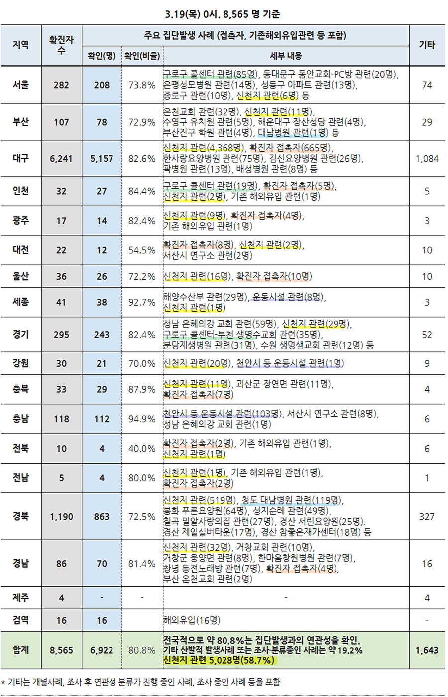 •3월 19일(목) 0시 8,565 명 기준. (출처: 중앙재난안전대책본부) 지역별 주요 감염 경로