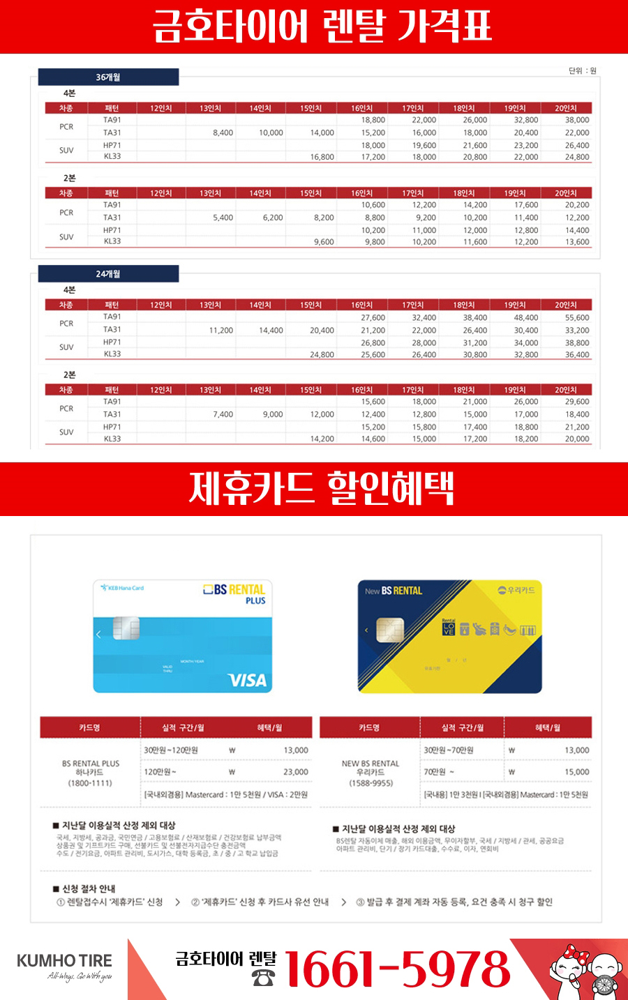 여기서 중요한건제휴카드 할인혜택이 상당히 좋더라구요예를들어 17인치 최고급타이어를 3년으로 계약시 매달 22,000원씩 내야하는데 제휴카드 만들어서 결제시에는 카드사용금액에 따라 할인을 더 받더라구요 30만원 실적만 되도 13,000원 할인들어가서 월 9,000원씩만 내면 되는거니깐 비용에 대한 부담감이 전~혀 없을거에요!