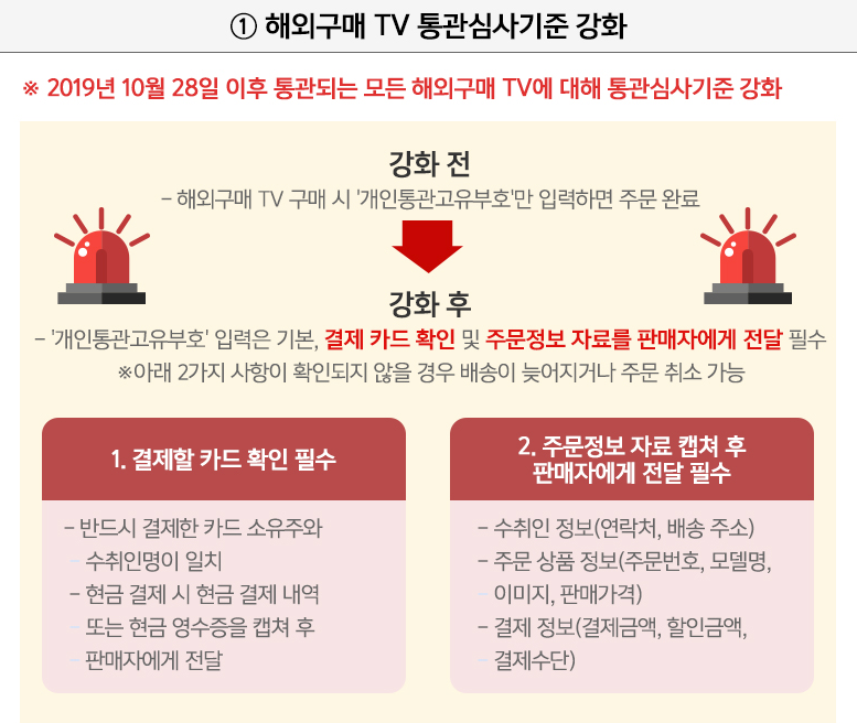 2019년 10월 28일 기준으로 통관되는 모든 해외구매 TV에 대해 관세청의 통관심사기준 강화로 인해 구매 전 필히 확인해 주시는 것이 좋습니다. 반드시 결제한 카드 소유주와 수취인명이 일치해야 하며, 주문정보 자료를 판매자에게 전달해야만 통관이 가능합니다.