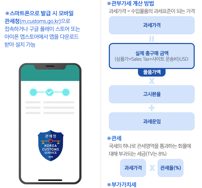 관부가세는 구입 금액이 150달러(미국은 200달러) 초과시 금액의 약 18%(관세 8%, 부가가치세 10%) 정도를 납부하게 됩니다. 또, 정격소비전력 300W 이상, 42인치형을 초과하는 LCD, OLED TV는 개별소비세 3.5%가 추가로 부가 됩니다.