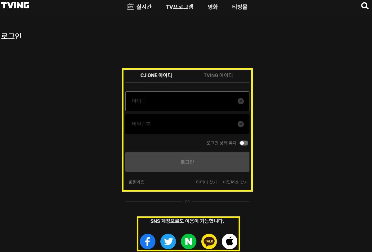 회원 가입은 CJ ONE 통합 회원 가입 또는 네이버, 카카오 등 SNS계정으로도 쉽게 가입이 가능합니다. 기존의 티빙 아이디가 있으시다면 티빙 아이디로 로그인 하시면 됩니다.