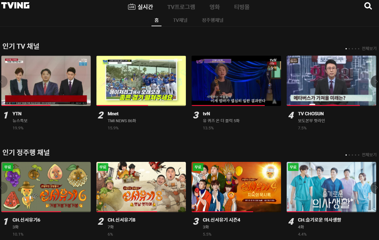 아래 인기 정주행 채널은 회원가입시 추가요금 없이 무료로 다시보기 하실 수 있습니다. 현재 신서유기, 슬기로운 의사생활, 삼시세끼, 도깨비, 대탈출, 미스터션샤인 등을 보실 수 있습니다.