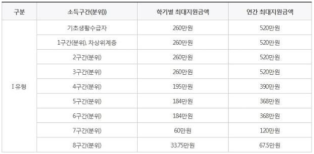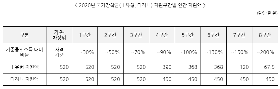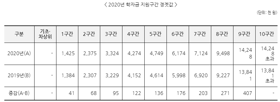 이에 따라 20년도 국가장학금은 지원구간 심사에 따른 월 소득 인정액을 기준으로 지원 8구간 이하 학생들에게 연간 520만원 부터 67만 5천원 범위 내에서 지원을 합니다.