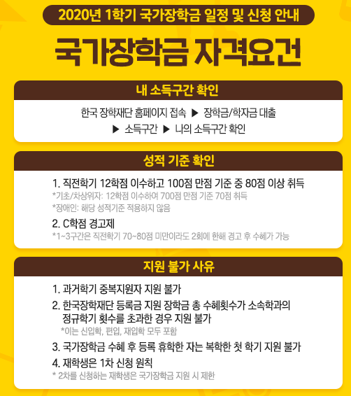 한국장학재단 홈페이지에서 국가장학금 자격요건을 확인할 수 있는데요, 나의 소득분위를 먼저 확인하고 성적 기준 확인을 하시면 됩니다. 직전 학기 12학점을 이수하고 100점 만점 기준 80점 이상 취득을 하시면 되는데요, 기초수급대상자나 차상위자는 12학점 이수에 100점 만점 기준 70점 이상을 취득하면 됩니다. 장애인은 성적기준을 적용하지 않는다고 하니 참고하시고, C학점 경고제라고 1~3구간은 직전학기 70~80점 미만이라도 2회에 한해 경고 후 수혜가 가능하다고 합니다.