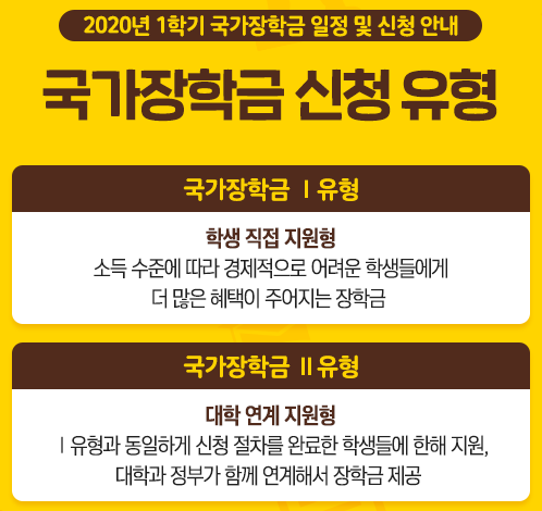 국가장학금은 1유형과 2유형이 있는데요, 1유형은 학생 직접 지원형으로 소득 수준에 따라 경제적으로 어려운 학생들에게 더 많은 혜탹이 주어지는 장학금이며, 2유형은 1유형과 동일하게 신청절차를 완료한 학생들에 한해 대학과 정부가 함께 연계해서 장학금을 지원하는 유형입니다.