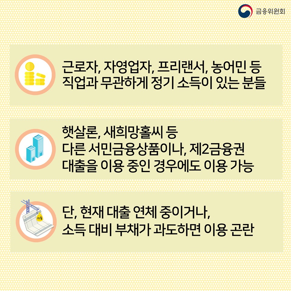 이건 저소득/저신용 지원이 목적이기 때문이예요(단, 신용불량자 & 무직자의 경우 신청 불가능)