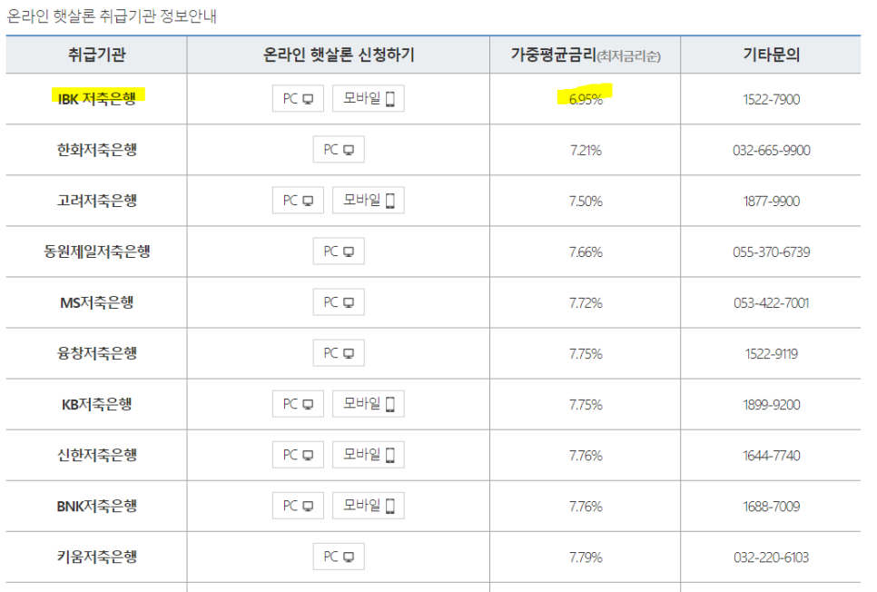 서민금융진흥원에서 제공하는 취급기관 정보자료에 보시는 것 처럼 IBK가 가중평균금리가 가장 낮습니다(저기에서 개인별 +@가 붙어요)