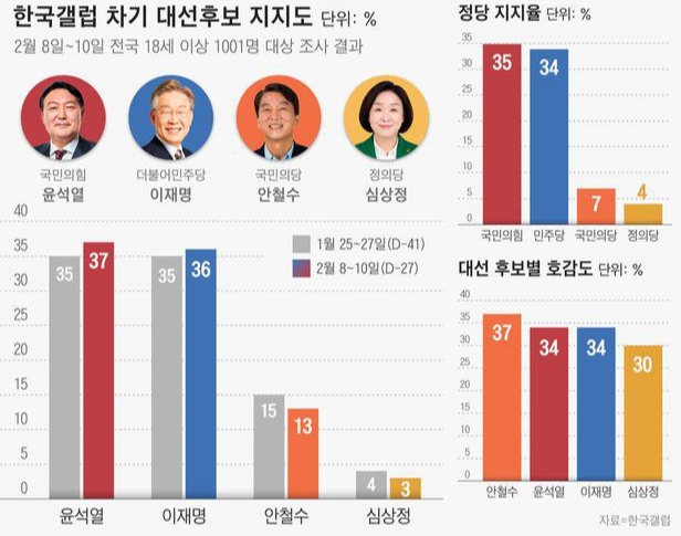 2월 8일부터 10일까지 전국 18세 이상 1,001명을 대상으로 한 조사 결과 윤석열 후보자가 1위, 이재명 후보자가 2위, 안철수 후보자가 3위, 심상정 후보자가 4위를 차지했습니다. 윤석열 후보자와 이재명 후보자는 근소한 차이를 보이며 박빙을 보이고 있습니다. 여론조사 결과의 현황이 궁금하신 분들은 아래 링크를 통해 이동하시면 바로 확인하실 수 있습니다.