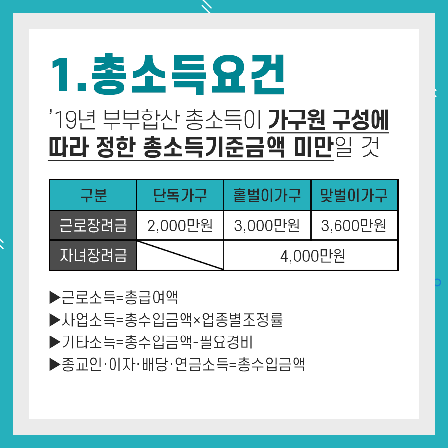 '19년 부부합산 총소득이 가구원 구성에 따라 정한 총소득기준금액 미만이어야 합니다.