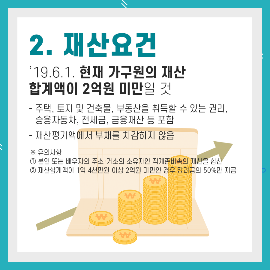 '19.6.1 현재 가구원의 재산 합계액이 2억 원 미만이어야 합니다.