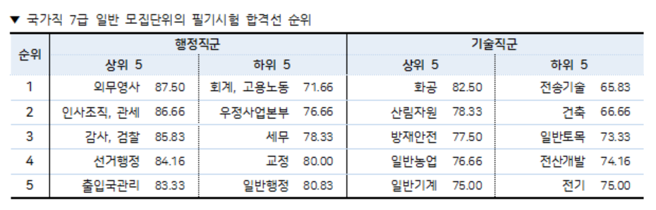 2019년 국가직 7급공무원시험에서 합격선이 가장 높았던 직렬과, 가장 낮았던 직렬 5개를 확인해보겠습니다!