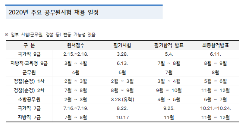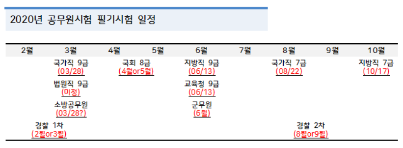 2020년 공무원시험의 일정이 대략적으로 공개되었습니다. 국가직 7급공무원의 필기시험은 8월, 지방직과 서울시의 필기시험은 10월쯤으로 계획되어 있습니다. 특히 내년의 시험은 국가직 7급공무원 시험제도가 바뀌기 전, 마지막 기회이기 때문에 많은 분들이 합격을 목표로 절실하게 공부하고 있습니다!