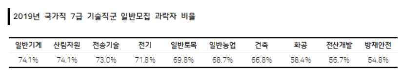 기술직군의 과락률도 매우 높게 나왔습니다! 행정직군과 달리, 기술직군은 어느 한 과목의 이유가 아닌, 각 직렬마다 지정되어 있는 직렬 관련의 전공과목의 난이도가 높아서 이러한 결과가 나타났다고 합니다. 일반기계, 산림자원, 전공기술, 전기직은 무려 70%가 넘는 과락률을 보였습니다!