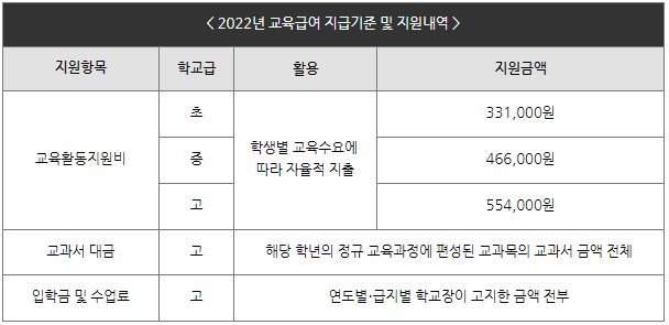 교육활동지원비, 교과서 대금, 입학금 및 수업료 등을 지원합니다.