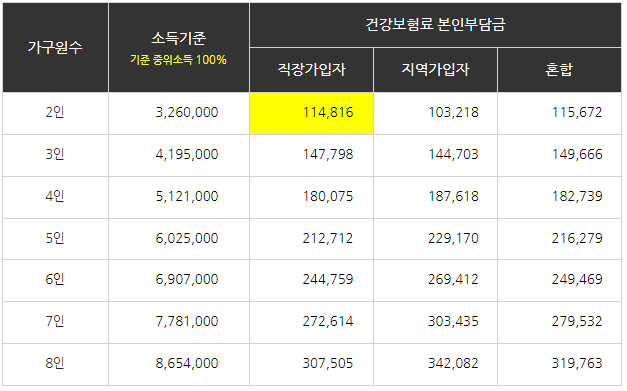 | (예시) 건강보험료 소득판정 기준(기준 중위소득 100%) *노인장기요양보험료 미포함 A씨(2인 가구/직장가입자)의 건강보험료 납부액이 10만 원이라면? A씨의 건보료 납부액은 2인가구 직장가입자인114,816만원에 못 미치므로, 기준 중위소득 100% 이하에 해당 |