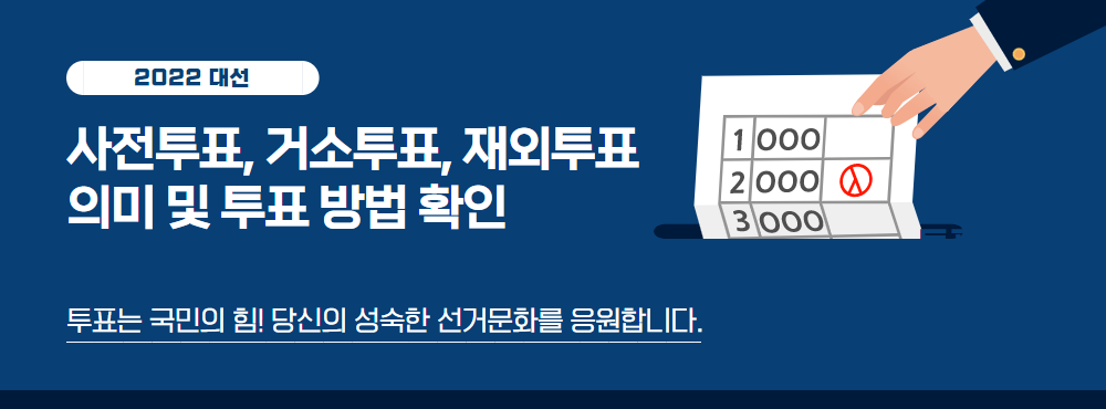 사전투표는 3월 9일에 있을 대통령 선거 투표 당일날 투표가 어려운 선거인이 정해진 사전투표 기간 동안 본인 확인이 가능한 신분증 지참 후 사전투표소가 설치된 곳에서 투표할 수 있는 제도입니다. 해당 구·시·군 관할구역 내에 주소를 둔 유권자인 관내선거인은 신분증 제시 및 본인 확인 > 투표용지 수령 > 기표소에 비치된 용구로 기표 > 투표함에 투표지를 넣고 퇴장하시면 됩니다. 해당 구·시·군 관할구역 밖에 주소를 둔 유권자인 관외선거인은 신분증 제시 및 본인 확인 > 투표용지와 주소라벨이 부착된 회송용봉투 수령 > 기표소에 비치된 용구로 기표 후 회송용봉투에 넣어 봉함 > 투표함에 회송용봉투를 넣고 퇴장하시면 됩니다. 관련 정보가 궁금하신 분들은 아래 링크를 통해 이동하시면 확인하실 수 있습니다.