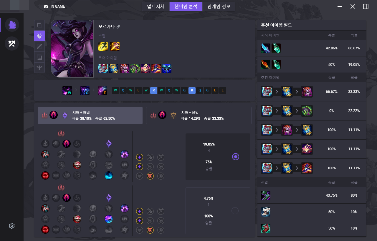 챔피언을 선택하면 챔피언 분석에서 챔피언과 라인에 맞는 룬과 추천 아이템 빌드도 볼 수 있습니다.