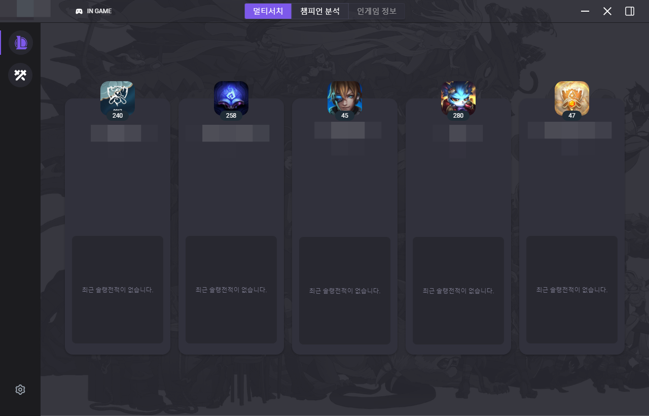게임 시작 후 중앙 상단에 멀티서치를 클릭하면 우리 팀의 티어, 레벨 , 최근 솔랭 전적을 확인할 수 있습니다.