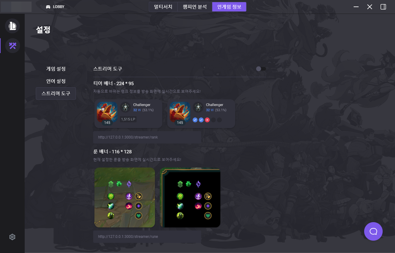 티어 배너와 룬 배너를 켜거나 끌 수 있습니다.